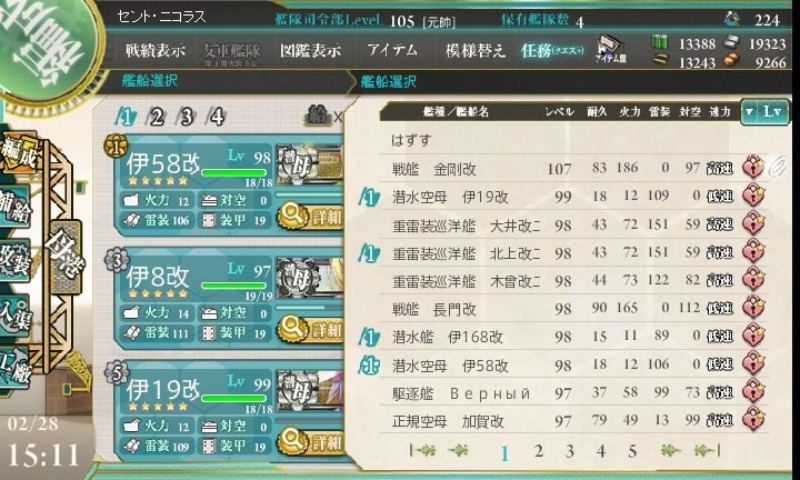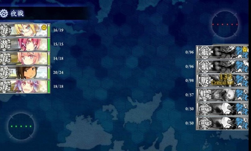ボスはパターン2しか潜水艦いないけど、複縦で反抗戦とか不利引いたらフラ潜おとせそーにないんじゃねって思って。ヴェルちゃん中破とかならあきらめて複縦なり単縦でいんじゃね。