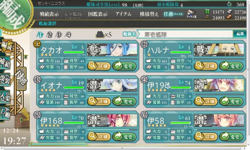 潜水艦のみで挑めば旗艦たかお落として勝てるとおもうけどなー、バリアしまくったとかハルナに攻撃いったとかで負けたんかなー?いやそれでもダメージ勝ちか、謎。