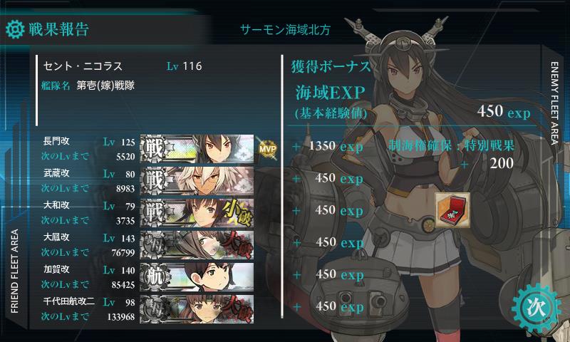 これで2戦目が1回目は空母ヲ改でたんだけど今回はヲ級2隻のぬる編成だったせいか制空優勢とれた、3戦目も優勢とれた。まあ確保は無理やしボーキはこんくらいとぶってことで。